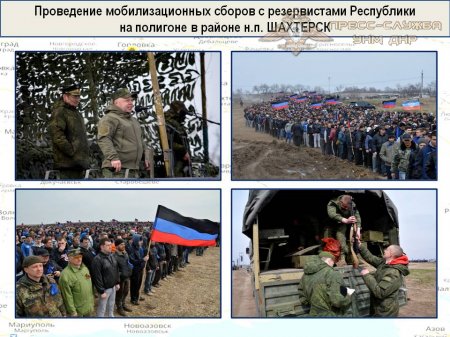 На прошедшей неделе, с 1 по 7 апреля, в соединениях и воинских частях Народной милиции Донецкой Народной Республики основные усилия были сосредоточены на проведении мобилизационных сборов резервистов Республики на полигоне в районе н.п. ШАХТЕРСК. Общее количество резервистов составило более 27 тысяч человек. Основной задачей сборов являлась отработка слаженности действий мобилизационных резервов Республики в случае обострения обстановки в ДНР.