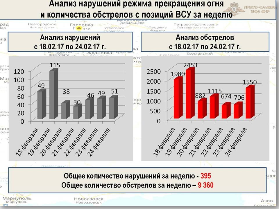 Со стороны ВСУ огневому воздействию были подвергнуты практически все населенные пункты Республики. В том числе: Зайцево, Гольмовский, Красный Партизан, Доломитное, Широкая Балка, Озеряновка, Михайловка, Спартак, Ясиноватая, Яковлевка, Жабичево, Васильевка, Крутая Балка, Александровка, Стыла Докучаевск, Набережное, Петровское, Саханка, Ленинское, Коминтерново, Веселое, Сигнальное, Луганское, Новожиловка, Еленовка, Староласпа, Белая Каменка, Новоласпа, Новомарьевка, Старомарьевка, Октябрь, Безыменное, Новая Таврия, Сосновское, район Аэропорта и Петровский район г. Донецка.