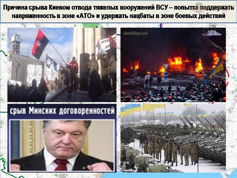 В течение недели, в целях срыва беспорядков в Киеве и недопущения убытия для участия в них националистических батальонов из зоны «АТО», путем поддержания напряженности на линии боевого соприкосновения, украинское руководство всеми силами пыталось саботировать выполнения своих обязательств по отводу тяжелого вооружения от линии соприкосновения. Несмотря на активное участие в переговорах представителей ОБСЕ, украинская сторона постоянно избегала выполнения данных обязательств. Причиной саботажа Киевом является страх президента Украины Порошенко перед возможностью радикальных националистов устроить в Киеве третий «Майдан» и свержение его власти.