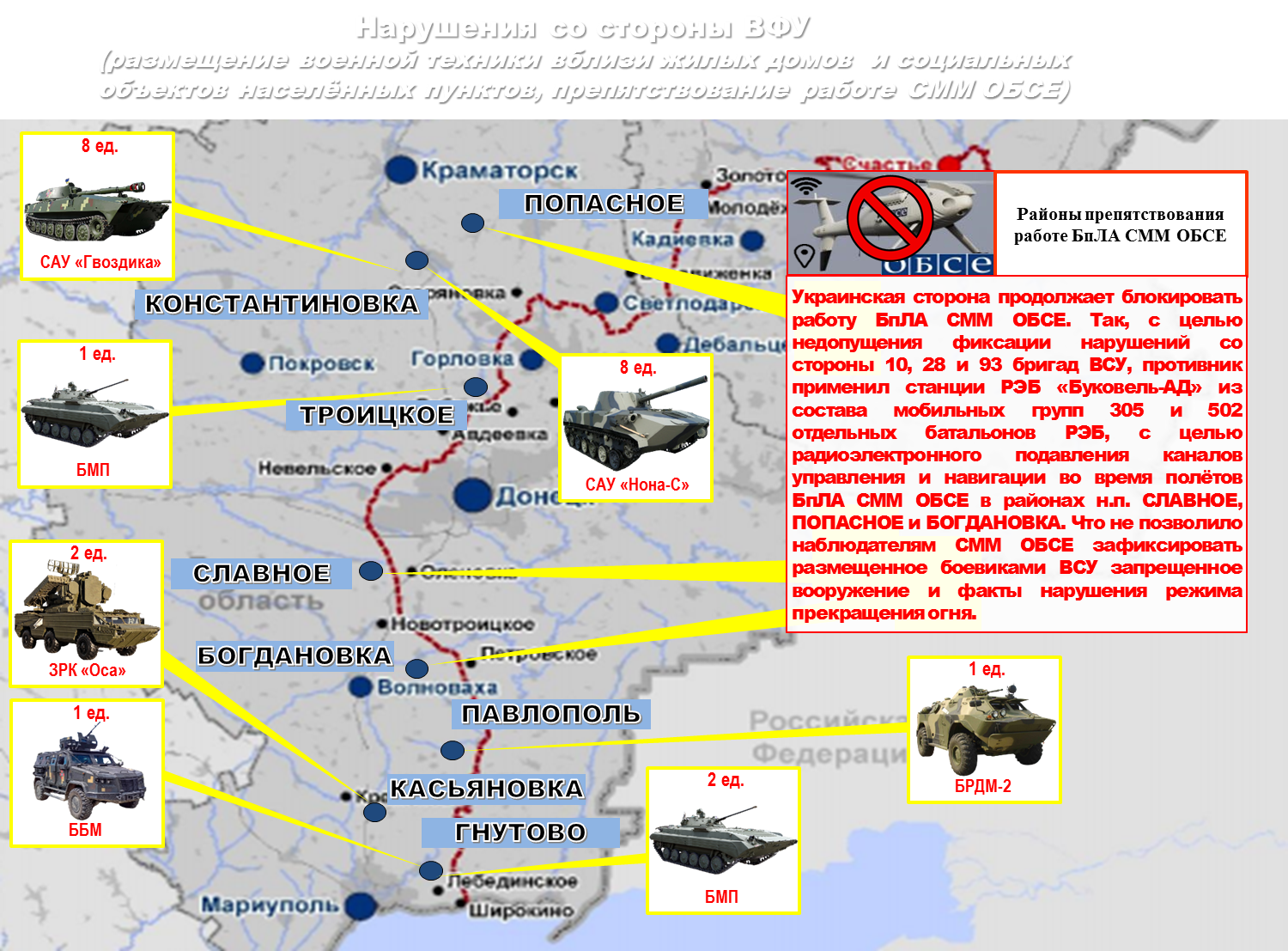Украинская сторона продолжает блокировать работу БпЛА СММ ОБСЕ. Так, с целью недопущения фиксации нарушений со стороны 10, 28 и 93 бригад, противник применил станции РЭБ «Буковель-АД» из состава мобильных групп 305 и 502 отдельных батальонов РЭБ, с целью радиоэлектронного подавления каналов управления и навигации во время полётов БпЛА СММ ОБСЕ в районах н.п. СЛАВНОЕ, ПОПАСНОЕ и БОГДАНОВКА. Это не позволило наблюдателям СММ ОБСЕ зафиксировать размещенное боевиками ВСУ запрещенное вооружение и факты нарушения режима прекращения огня.