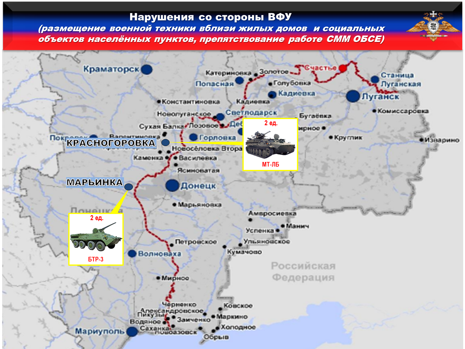 В нарушение ТРЕТЬЕГО пункта дополнительных мер, выявлено размещение ЧЕТЫРЕХ единиц вооружения и военной техники ВФУ вблизи жилых домов и муниципальных объектов на подконтрольной Украине территории.