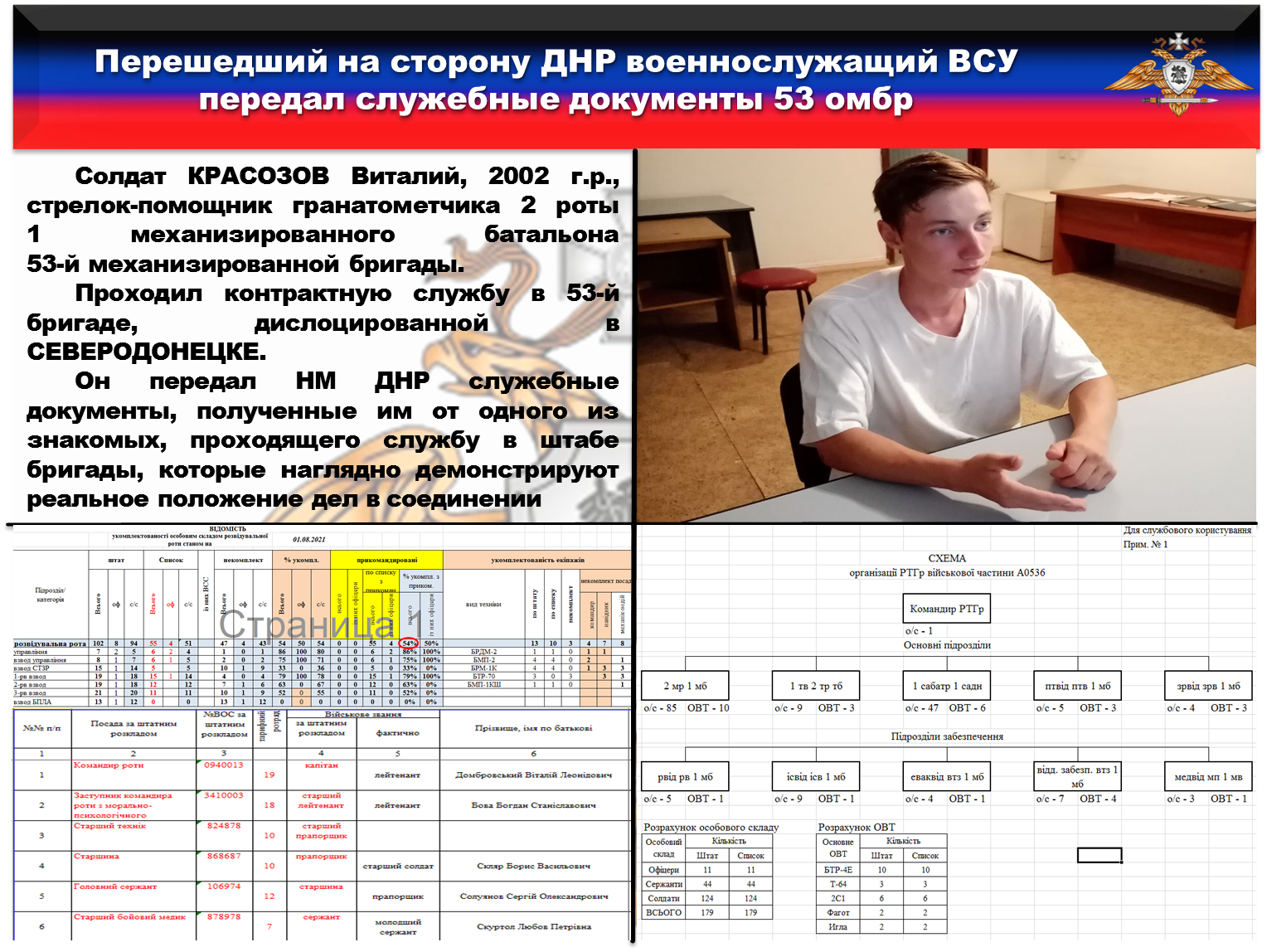 Помимо ценных разведывательных сведений, КРАСОЗОВ любезно передал нам служебные документы, полученные им от одного из знакомых, проходящего службу в штабе 53 бригады, которые подтверждают сказанное и наглядно демонстрируют реальное положение дел в соединении.