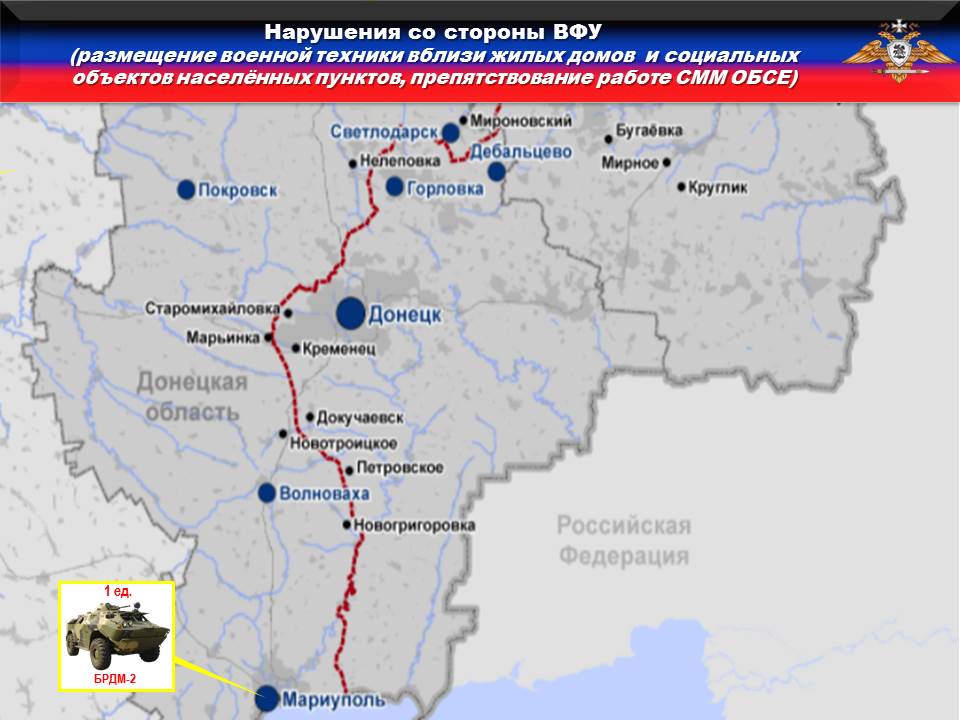 В нарушение ТРЕТЬЕГО пункта дополнительных мер, выявлено размещение вооружения и военной техники украинских вооруженных формирований вблизи жилых домов и муниципальных объектов на подконтрольной Украине территории: