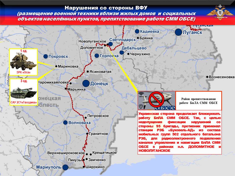 С целью недопущения фиксации нарушений со стороны 95-й бригады, противник применял станции РЭБ «Буковель-АД» для радиоэлектронного подавления каналов управления и навигации БпЛА СММ ОБСЕ в районах н.п. ДОЛОМИТНОЕ и НОВОЛУГАНСКОЕ.