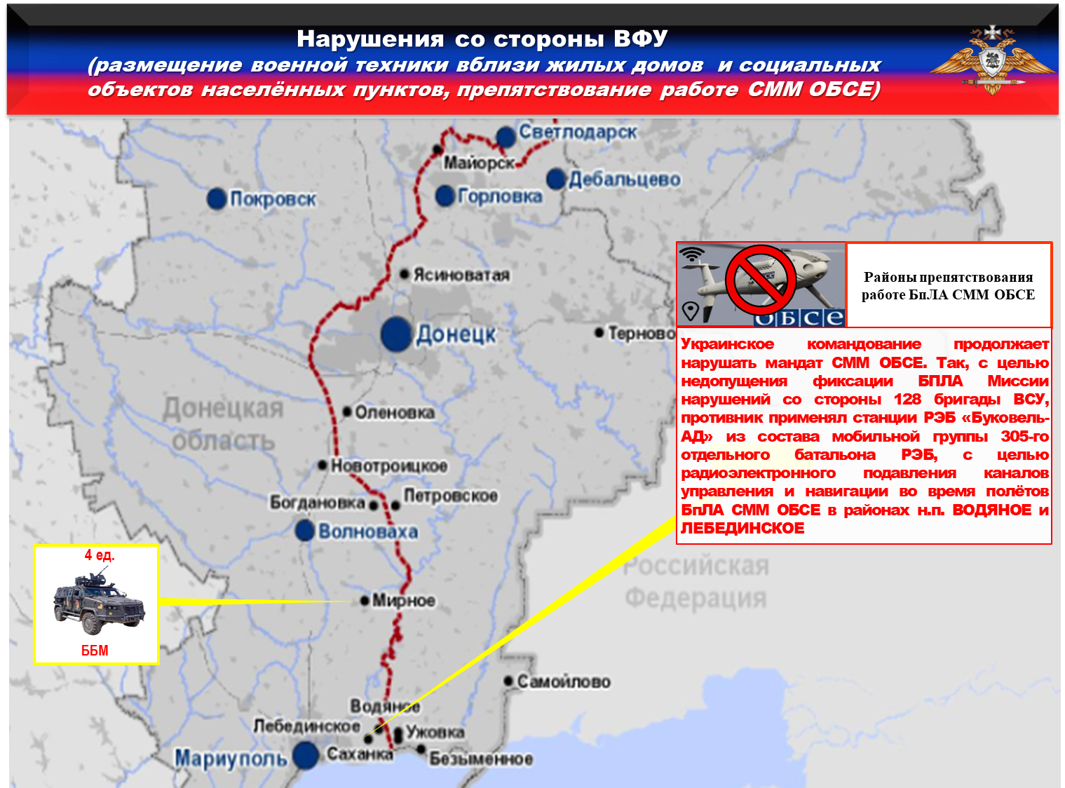 Украинское командование продолжает нарушать мандат СММ ОБСЕ. Так, с целью недопущения фиксации БПЛА Миссии нарушений со стороны 128 бригады, противник применял станции РЭБ «Буковель-АД» из состава мобильной группы 305-го отдельного батальона РЭБ, для радиоэлектронного подавления каналов управления и навигации во время полётов БпЛА СММ ОБСЕ в районах н.п. ВОДЯНОЕ и ЛЕБЕДИНСКОЕ.