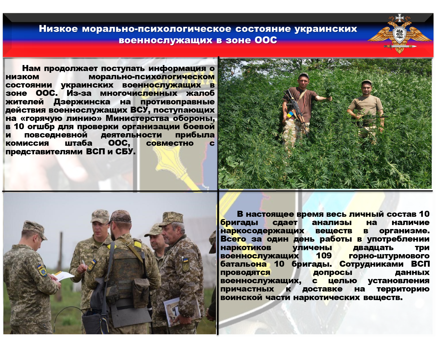 Нам продолжает поступать информация о низком морально-психологическом состоянии украинских военнослужащих в зоне ООС. Из-за многочисленных жалоб жителей Дзержинска на противоправные действия военнослужащих ВСУ, поступающих на «горячую линию» Министерства обороны, в 10 огшбр для проверки организации боевой и повседневной деятельности прибыла комиссия штаба ООС, совместно с представителями ВСП и СБУ. Задачей проверяющих является не только инспектирование бытовых условий в бригаде, но и проверка оперативной информации об организации офицерами бригады распространения наркотиков среди подчиненного личного состава.