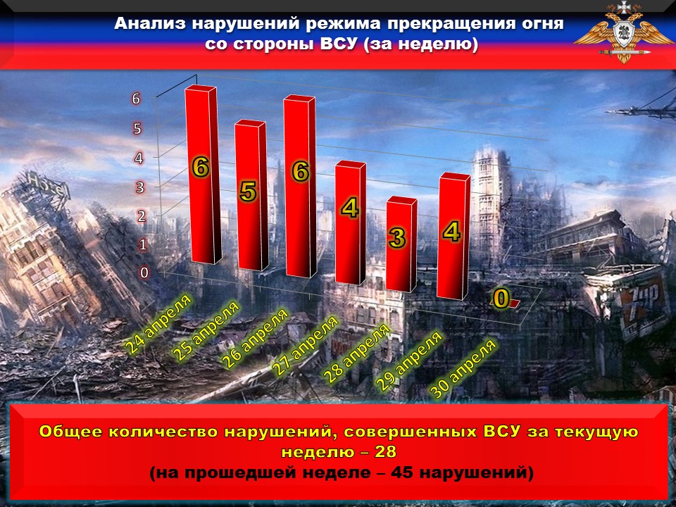 Указанные факты нарушений в оперативном порядке доведены до представителей украинской стороны в СЦКК, с целью своевременного принятия мер к нарушителям перемирия и исключения случаев фальсификации учетных данных о нарушениях режима прекращения огня со стороны украинских боевиков.