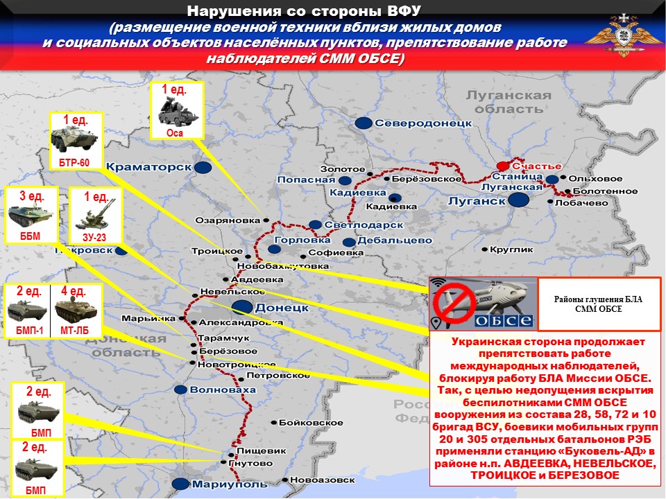 В нарушение ТРЕТЬЕГО пункта дополнительных мер, выявлено размещение ШЕСТНАДЦАТЬ единиц вооружения и военной техники ВФУ вблизи жилых домов и муниципальных объектов на подконтрольной Украине территории: