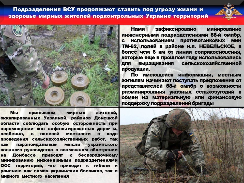 Так, нами зафиксировано минирование инженерными подразделениями 58-й омпбр, с использованием противотанковых мин ТМ-62, полей сельскохозяйственного назначения в районе н.п. НЕВЕЛЬСКОЕ, в более чем 6 км от линии соприкосновения.