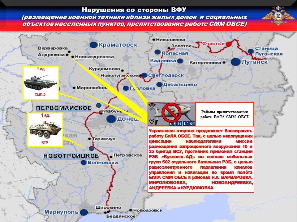 Украинская сторона продолжает блокировать работу БпЛА ОБСЕ. Так, с целью недопущения фиксации наблюдателями миссии размещения запрещенного вооружения 10 и 25 бригад, противник применил станции РЭБ «Буковель-АД» из состава мобильной группы 502 отдельного батальона РЭБ, для радиоэлектронного подавления каналов управления и навигации во время полёта БпЛА СММ ОБСЕ в районах н.п. ВАРВАРОВКА, МИРОЛЮБОВКА, НОВОАНДРЕЕВКА, АНДРЕЕВКА и КУРДЮМОВКА.