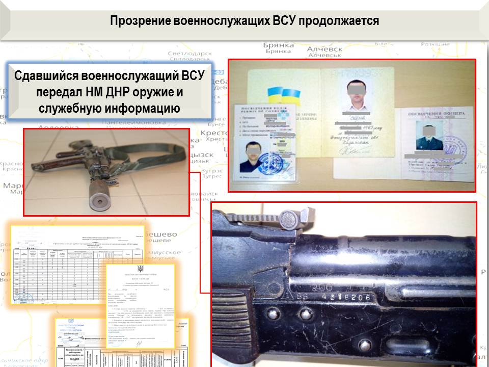 Как сообщалось ранее, на нашу сторону перешел военнослужащий ВСУ Сергей Т. Мы не раскрываем его личности и места прохождения службы по причине того, что у Сергея в Украине остались родственники и он опасается за их безопасность. Сегодня мы можем показать только часть его личных документов, а также его личное оружие и электронные версии некоторых служебных документов, которые он заблаговременно скопировал в штабе соединения.