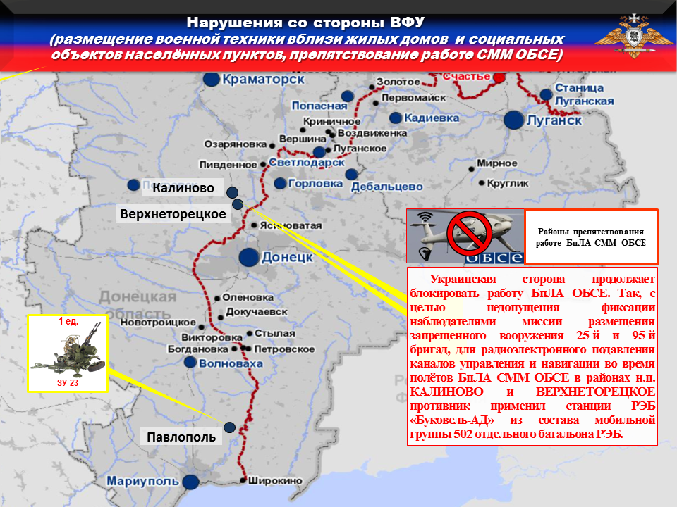 Украинская сторона продолжает блокировать работу БпЛА ОБСЕ. Так, с целью сокрытия от наблюдателей Миссии ОБСЕ фактов размещения запрещенного вооружения 25-й и 95-й бригад, противник применил станции РЭБ «Буковель-АД» из состава мобильной группы 502 отдельного батальона РЭБ для радиоэлектронного подавления каналов управления и навигации во время полётов БпЛА СММ ОБСЕ в районах н.п. КАЛИНОВО и ВЕРХНЕТОРЕЦКОЕ.