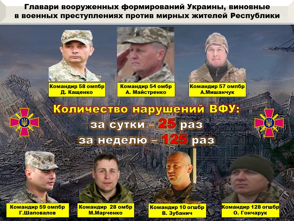 Все сведения с приложением фото и видеоматериалов направлены представителям международных организаций, находящимся в Республике, а также переданы в Генеральную прокуратуру для возбуждения уголовных дел в отношении военных преступников КАЩЕНКО, МАРЧЕНКО, МАЙСТРЕНКО, КОКОРЕВА, ШАПОВАЛОВА, ГОНЧАРУКА и ЗУБАНИЧА.