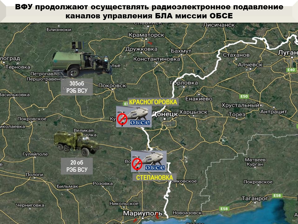 Согласно указаниям командования ООС, подразделения РЭБ с целью сокрытия фактов размещения запрещенной военной техники продолжают радиоэлектронное подавление каналов управления БЛА Миссии ОБСЕ. За истекшую неделю нами выявлены очередные факты работы мобильных групп РЭБ из состава 305 и 20-го батальона РЭБ в зоне ответственности 28-й и 128-й бригад ВФУ. Работа по подавлению каналов управления и навигации БЛА осуществлялась в районе н.п. КРАСНОГОРОВКА и СТЕПАНОВКА, где наблюдатели Миссии ОБСЕ были вынуждены прекращать работу из-за угрозы потери БЛА. Все факты препятствования со стороны украинских боевиков пролетам БЛА подтверждаются в официальных отчетах мониторинговой Миссии ОБСЕ.