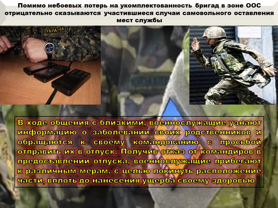 Помимо небоевых потерь на укомплектованности бригад в зоне ООС отрицательно сказываются участившиеся случаи самовольного оставления мест службы. Это связано в большей степени с ужесточением карантинных ограничений и запрет командованием телефонных переговоров военнослужащих с семьями с целью сокрытия истинного положения дел в соединениях и частях.
