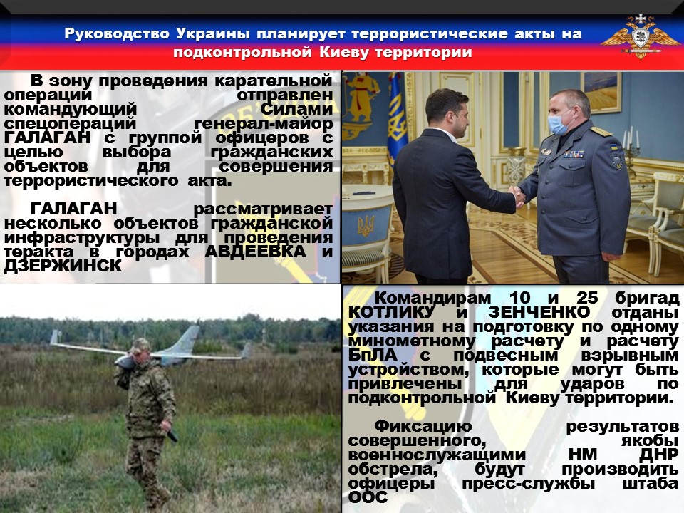 По указанию начальника Генерального штаба ВСУ ШАПТАЛА в зону проведения карательной операции отправлен командующий Силами спецопераций генерал-майор ГАЛАГАН с группой офицеров с целью выбора гражданских объектов для совершения террористического акта.