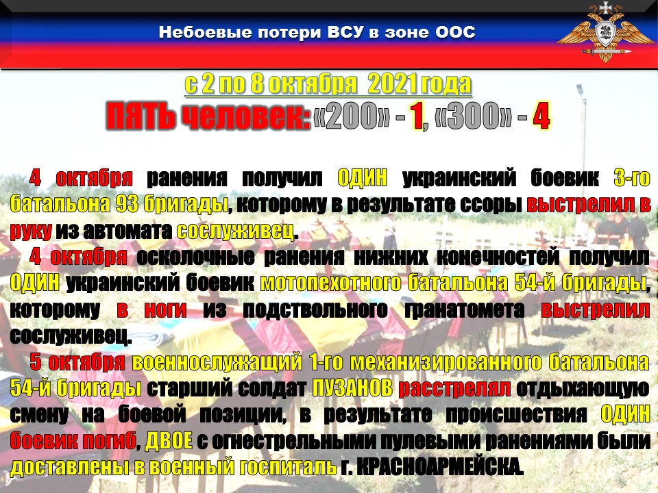 5 октября военнослужащий 1-го механизированного батальона 54-й бригады старший солдат ПУЗАНОВ расстрелял отдыхающую смену на боевой позиции, в результате происшествия ОДИН боевик погиб, ДВОЕ с огнестрельными пулевыми ранениями были доставлены в военный госпиталь г. КРАСНОАРМЕЙСКА.