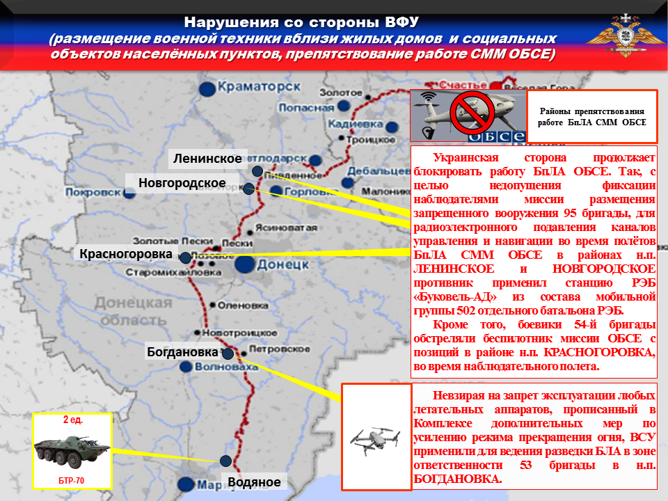 Украинская сторона продолжает блокировать работу БпЛА ОБСЕ. Так, с целью недопущения фиксации наблюдателями миссии размещения запрещенного вооружения 95 бригады, для радиоэлектронного подавления каналов управления и навигации во время полётов БпЛА СММ ОБСЕ в районах н.п. ЛЕНИНСКОЕ и НОВГОРОДСКОЕ противник применил станцию РЭБ «Буковель-АД» из состава мобильной группы 502 отдельного батальона РЭБ.