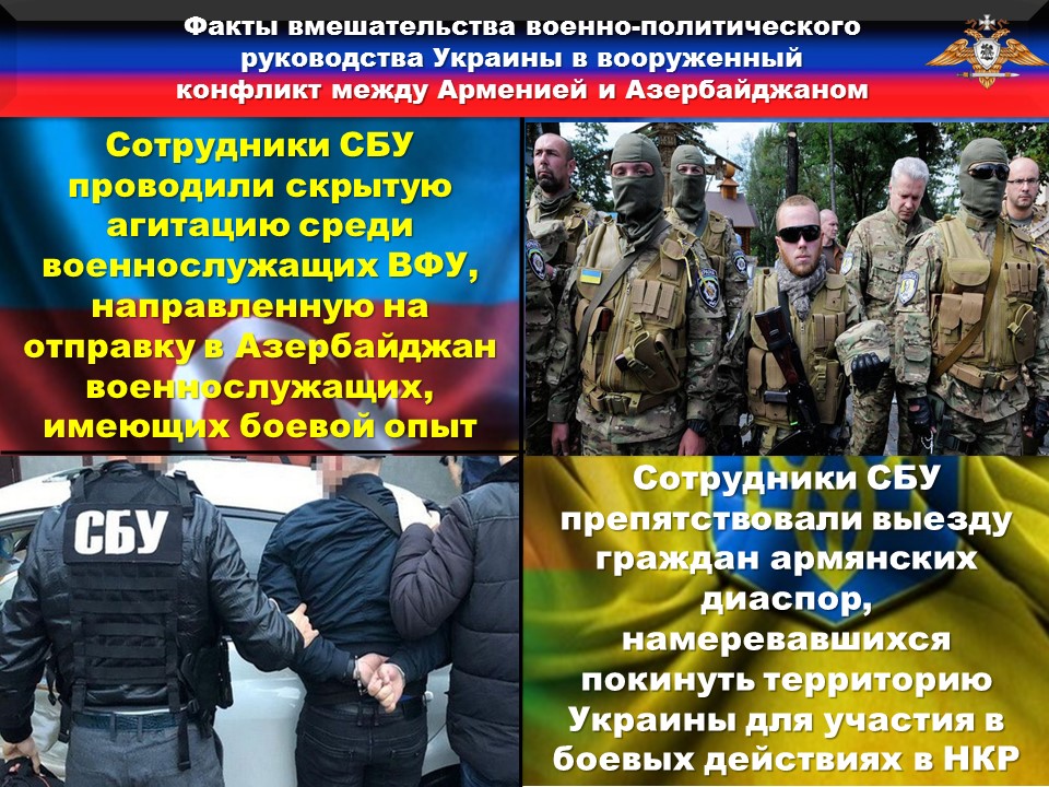 В период активной фазы конфликта сотрудники СБУ проводили скрытую агитацию среди военнослужащих ВФУ направленную на отправку в Азербайджан военнослужащих, имеющих боевой опыт.