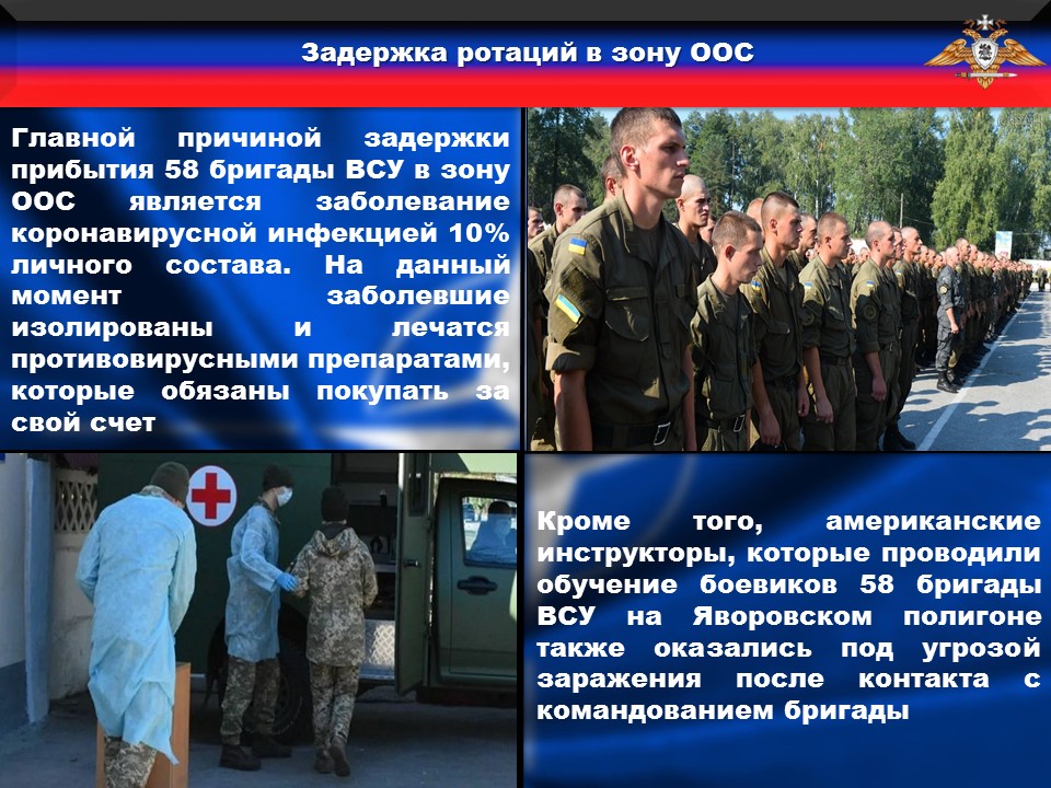 Проблема распространения коронавируса не обошла стороной 58 омпбр, спланированную к ротации в зону ООС. После прибытия на Яворовский полигон для прохождения обучения под руководством американских инструкторов, тестирование военнослужащих показало, что десять процентов бригады заражены коронавирусной инфекцией. В изоляторы с тяжелой формой пневмонии, осложненной коронавирусом госпитализировано ТРИДЦАТЬ СЕМЬ боевиков бригады, во главе с одним из заместителей комбрига. Остальным предписано соблюдать масочный режим, пить противовирусные препараты, которые военнослужащие вынуждены покупать за свой счет.