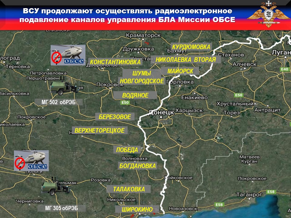 За неделю зафиксировано ПЯТНАДЦАТЬ фактов подавления каналов управления и навигации БпЛА наблюдателей СММ ОБСЕ вдоль линии боевого соприкосновения в районах населенных пунктов НОВГОРОДСКОЕ, НИКОЛАЕВКА ВТОРАЯ, КУРДЮМОВКА, ПОБЕДА, МАЙОРСК, БОГДАНОВКА, ШУМЫ, КОНСТАНТИНОВК, ВЕРХНЕТОРЕЦКОЕ, БЕРЕЗОВОЕ, ТАЛАКОВКА, ВОДЯНОЕ и ШИРОКИНО.