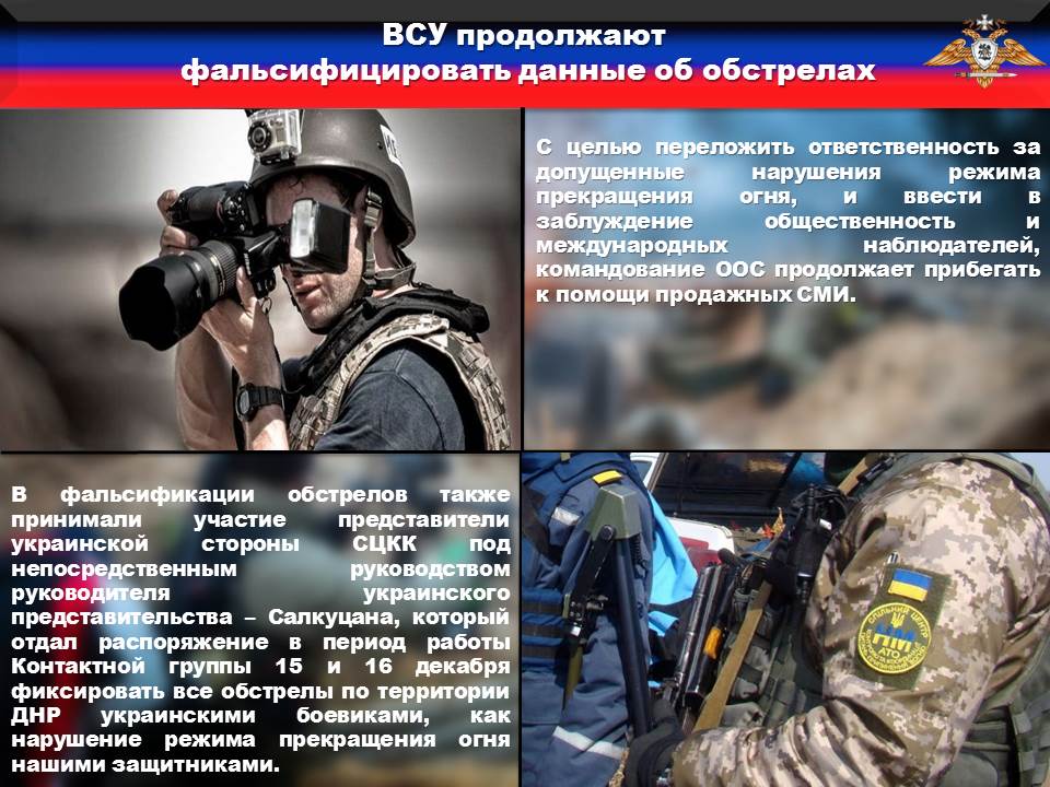 Несмотря на мирные инициативы руководства Донецкой Народной Республики противник не оставляет попыток дестабилизировать обстановку на линии боевого соприкосновения. При этом, с целью переложить ответственность за допущенные нарушения режима прекращения огня, и ввести в заблуждение общественность и международных наблюдателей, командование ООС продолжает прибегать к помощи продажных СМИ. В частности, на прошедшей неделе наша разведка зафиксировала нахождение в зонах ответственности 36-й, 79-й, 56-й, 72-й и 35-й бригад ПЯТИ журналистских групп телеканалов «1+1», «ICTV», «5 канал», ТРК «Донбасс онлайн» и «Радио Свобода». Их деятельность координировали офицеры сводного отряда 74 Центра ИПсО капитан Дячук и капитан Канинец, в распоряжении которых для обеспечения СМИ постановочными кадрами находились подразделения специального назначения. В фальсификации обстрелов также принимали участие представители украинской стороны СЦКК под непосредственным руководством руководителя украинского представительства – Салкуцана, который отдал распоряжение в период работы Контактной группы 15 и 16 декабря фиксировать все обстрелы по территории ДНР украинскими боевиками, как нарушение режима прекращения огня нашими защитниками.