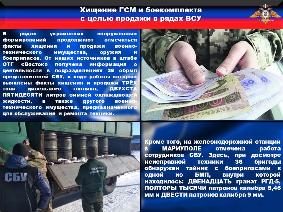 В рядах украинских вооруженных формирований продолжают отмечаться факты хищения и продажи военно-технического имущества, оружия и боеприпасов. От наших источников в штабе ОТГ «Восток» получена информация о деятельности в подразделениях 36 обрмп представителей СБУ, в ходе работы которых выявлены факты хищения и продажи ТРЁХ тонн дизельного топлива, ДВУХСТА ПЯТИДЕСЯТИ литров зимней охлаждающей жидкости, а также другого военно-технического имущества, предназначенного для обслуживания и ремонта техники.