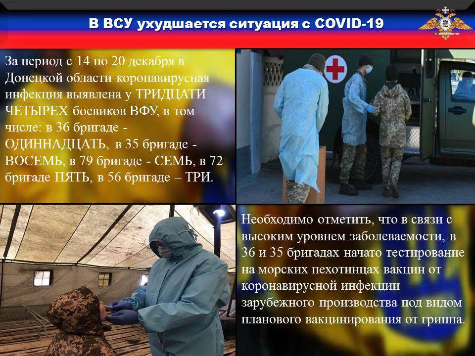 За период с 14 по 20 декабря в Донецкой области коронавирусная инфекция выявлена у ТРИДЦАТИ ЧЕТЫРЕХ боевиков ВФУ, в том числе: в 36 бригаде - ОДИННАДЦАТЬ, в 35 бригаде - ВОСЕМЬ, в 79 бригаде - СЕМЬ, в 72 бригаде ПЯТЬ, в 56 бригаде – ТРИ.