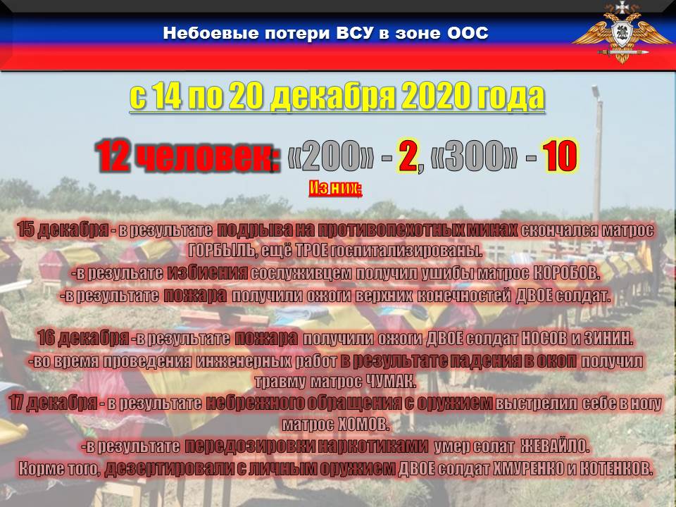 За неделю небоевые потери в вооружённых формированиях Украины составили ДВЕНАДЦАТЬ боевиков, из которых ДВОЕ погибли: