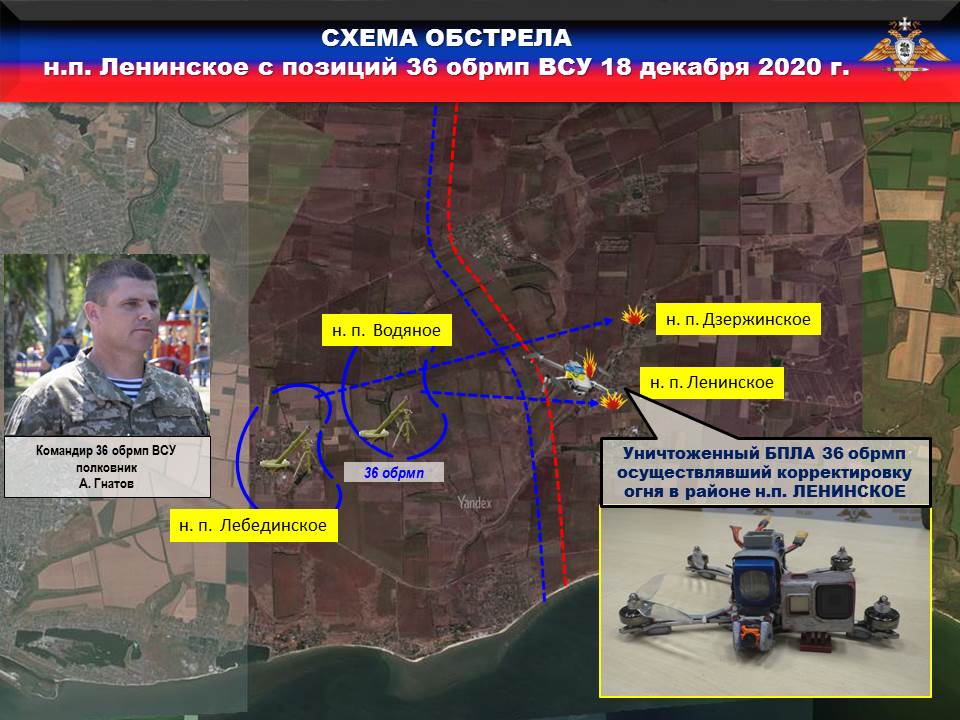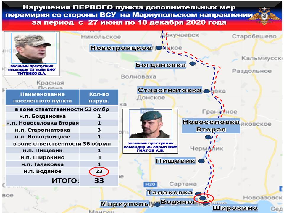На Мариупольском направлении по преступному приказу командира 36 бригады ГНАТОВА, боевики батальона морской пехоты ДВАЖДЫ открывали минометный огонь, выпустив с позиций н.п. ЛЕБЕДИНСКОЕ ДЕСЯТЬ 120-мм мин в направлении н.п. ДЗЕРЖИНСКОЕ и с позиций в районе н.п. ВОДЯНОЕ ШЕСТЬ 120-мм мин по н.п. ЛЕНИНСКОЕ.