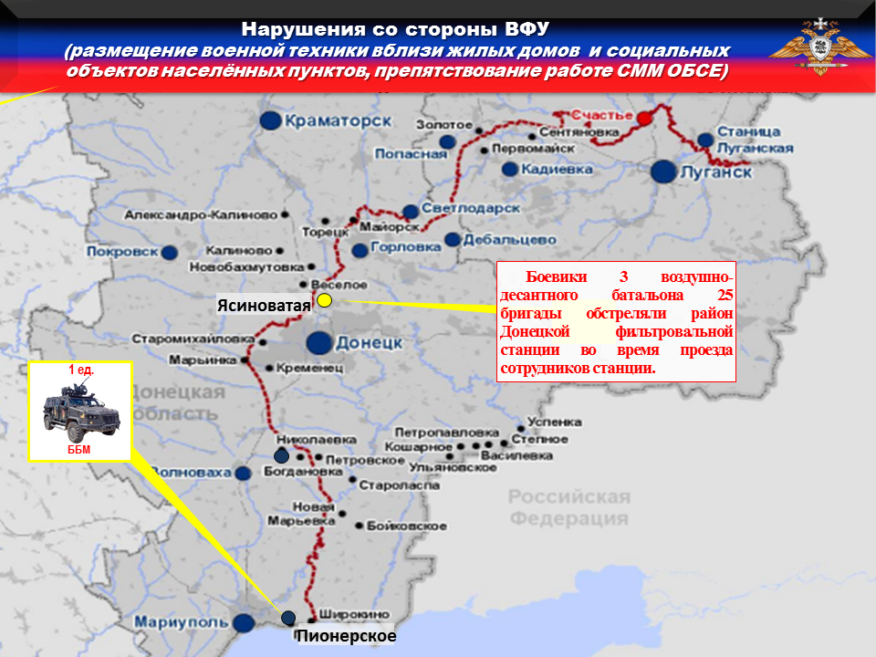 Кроме того, боевики 3 воздушно-десантного батальона 25 бригады обстреляли район Донецкой фильтровальной станции во время проезда сотрудников станции.