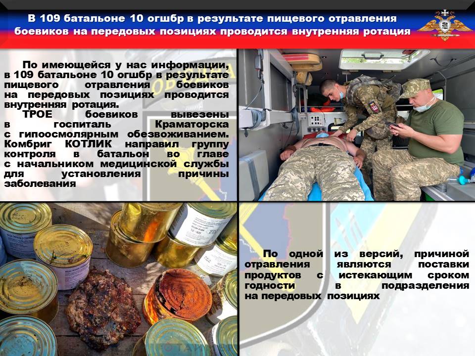 По имеющейся у нас информации, в 109 батальоне 10 огшбр в результате пищевого отравления боевиков на передовых позициях проводится внутренняя ротация.