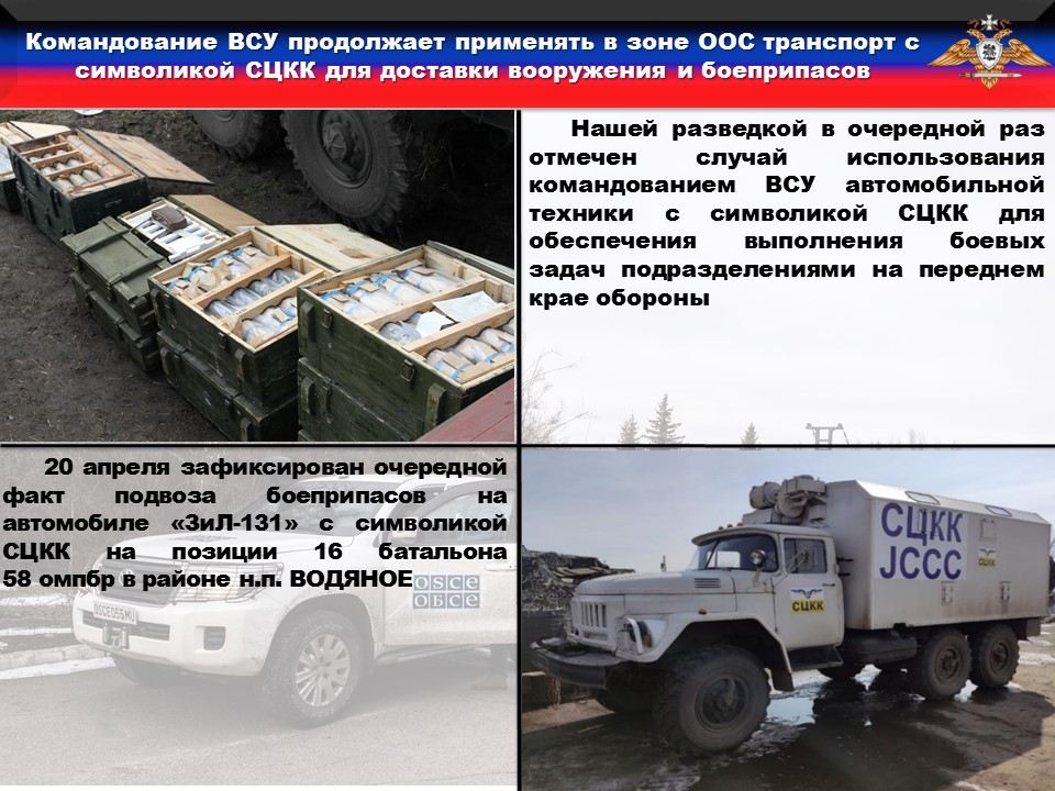 Так, 20 апреля зафиксирован очередной факт подвоза боеприпасов на автомобиле «ЗиЛ-131» с символикой СЦКК на позиции 16 батальона 58 омпбр в районе н.п. ВОДЯНОЕ.