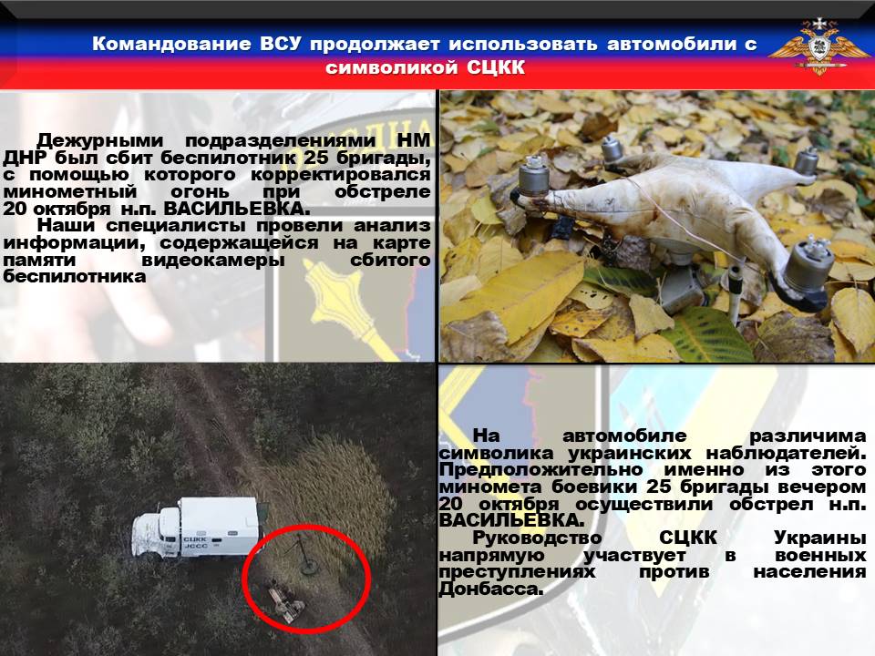 На представленном вашему вниманию видеофрагменте отчетливо видно, что боевики 25 десантно-штурмовой бригады выгружают из автомобиля ЗИЛ белого цвета миномет калибром 120 мм и боеприпасы к нему. На автомобиле различима символика украинских наблюдателей. Предположительно именно из этого миномета боевики 25 бригады вечером 20 октября осуществили обстрел н.п. ВАСИЛЬЕВКА.