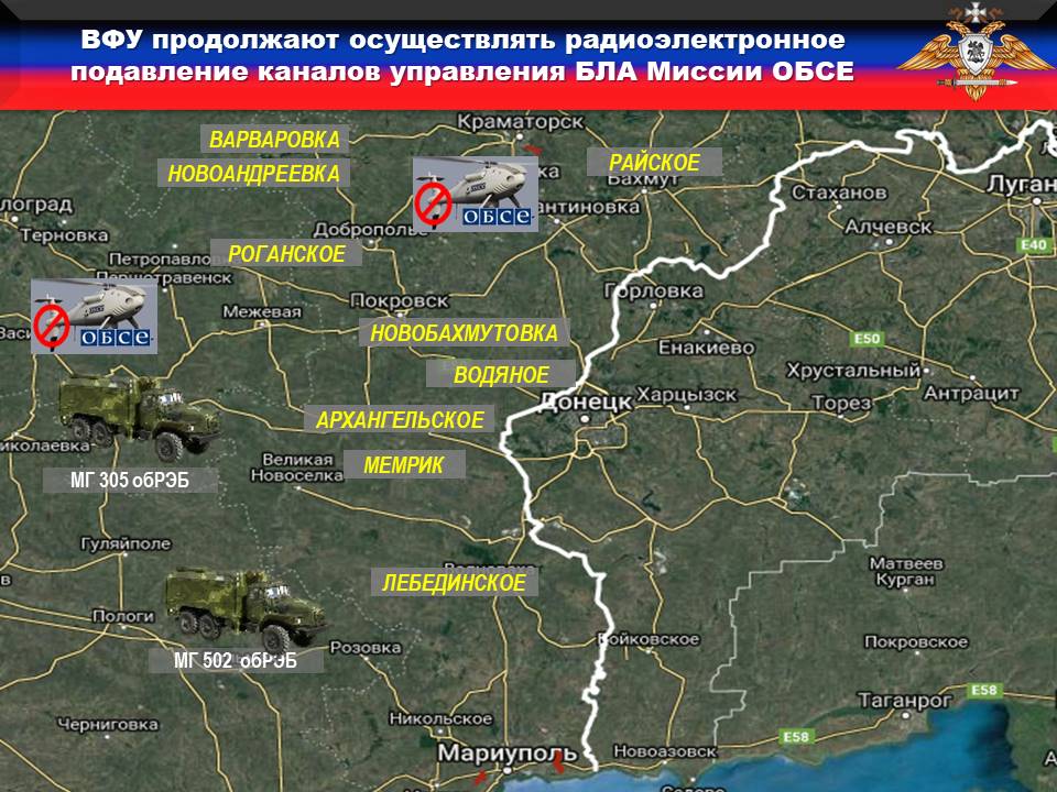 За неделю зафиксировано ДЕВЯТНАДЦАТЬ фактов подавления каналов управления и навигации БпЛА наблюдателей СММ ОБСЕ вдоль линии боевого соприкосновения, в районах ДВЕНАДЦАТИ населенных пунктов: ВАРВАРОВКА, РОГАНСКОЕ, МЕМРИК, ВОДЯНОЕ, ЛЕБЕДИНСКОЕ, НОВОАНДРЕЕВКА, РАЙСКОЕ, НОВОБАХМУТОВКА, АРХАНГЕЛЬСКОЕ, СЕРГЕЕВКА, БАХМУТ и СТАРОРАЙСКОЕ.