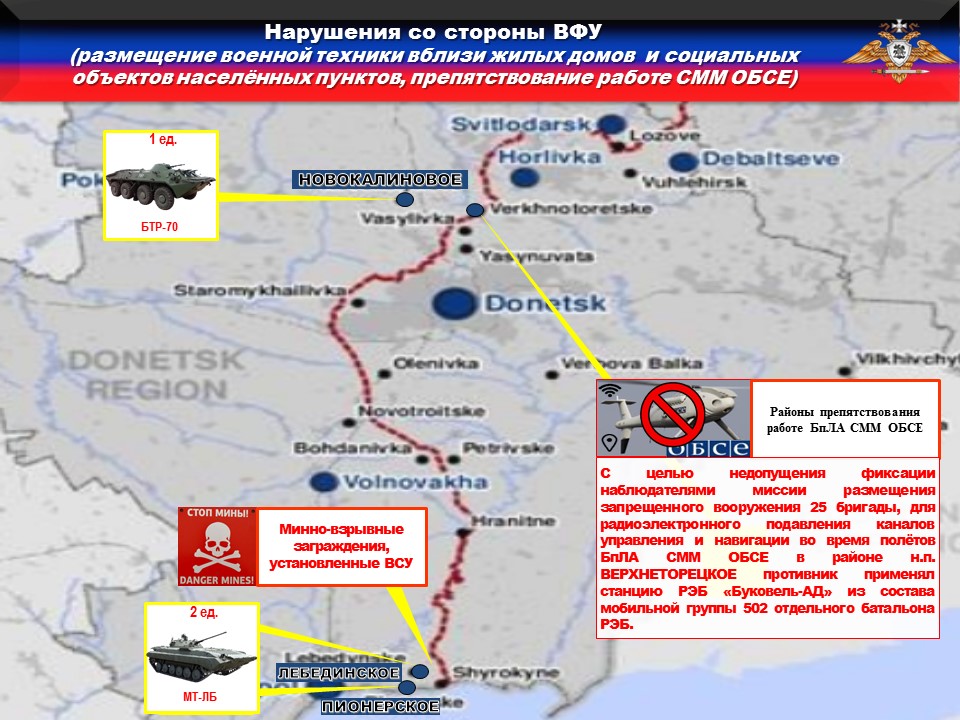 Украинская сторона продолжает блокировать работу БпЛА ОБСЕ. Так, с целью недопущения фиксации наблюдателями миссии размещения запрещенного вооружения 25 бригады, для радиоэлектронного подавления каналов управления и навигации во время полётов БпЛА СММ ОБСЕ в районе н.п. ВЕРХНЕТОРЕЦКОЕ противник применил станцию РЭБ «Буковель-АД» из состава мобильной группы 502 отдельного батальона РЭБ.