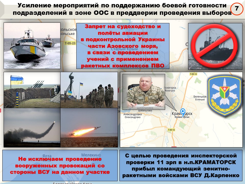 Кроме того, стало известно, что командование ВМС Украины в период с 28 по 31 марта под предлогом проведения учений с применением ракетных комплексов ввело запрет на судоходство и полетов авиации в подконтрольной части Азовского моря. В этих целях, 27 марта в КРАМАТОРСК отмечено прибытие командующего зенитно-ракетными войсками ВС Украины генерал-майора Д.Карпенко. В ходе визита он проинспектировал подразделения 11 зенитно-ракетного полка с целью оценки готовности к выполнению задач по предназначению на Мариупольском направлении. В этой связи не исключаем проведение вооруженных провокаций на данном участке с целью обострения обстановки, с последующим обвинением Народной милиции в глазах общественности.