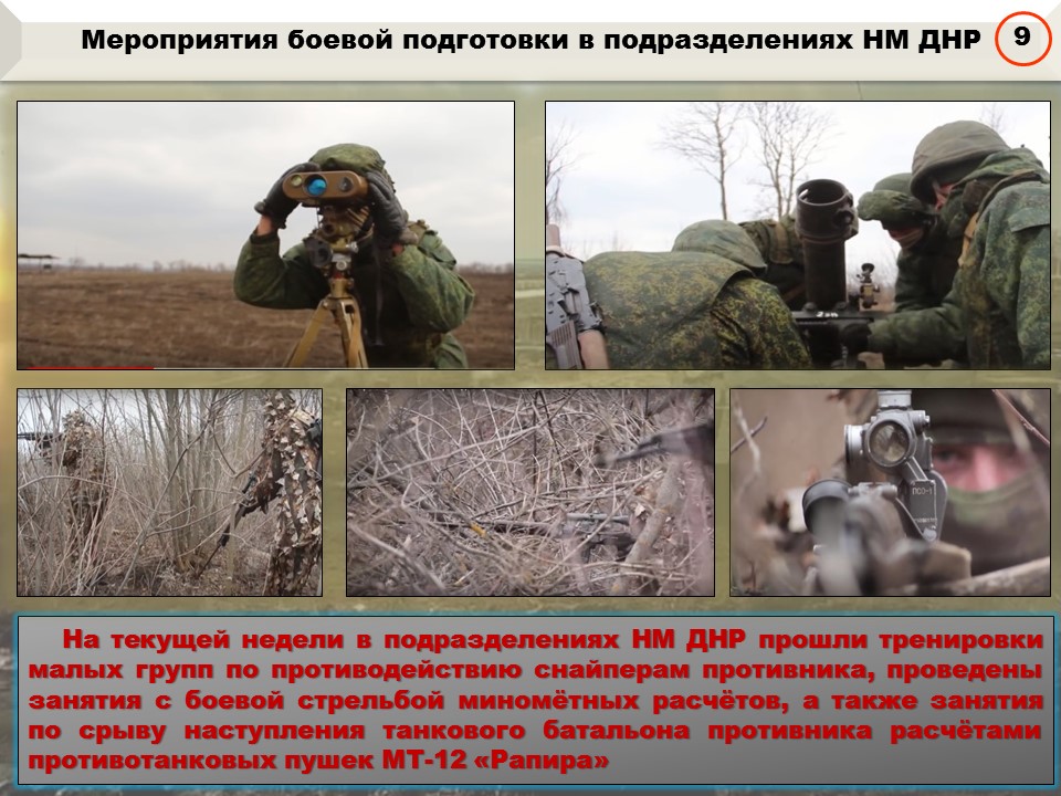 На прошедшей недели в подразделениях НМ ДНР прошли тренировки малых групп по противодействию снайперам противника, проведены занятия с боевой стрельбой миномётных расчётов, а также занятия по срыву наступления танкового батальона противника расчётами противотанковых пушек МТ-12 «Рапира».