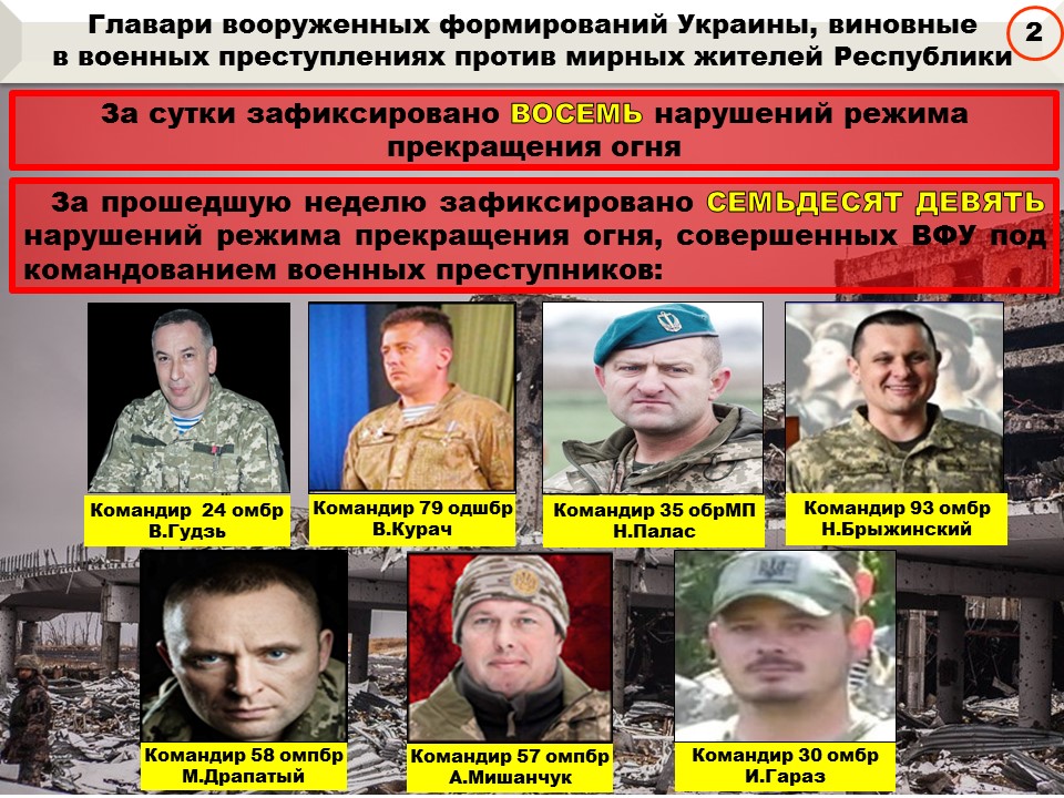 Всего за прошедшую неделю зафиксировано СЕМЬДЕСЯТ ДЕВЯТЬ обстрелов по районам ДВАДЦАТИ ОДНОГО населённого пункта Республики с применением артиллерии калибром 152 мм, танкового вооружения, миномётов калибром 120 и 82 мм, вооружения БМП, гранатометов, крупнокалиберных пулемётов и стрелкового оружия.