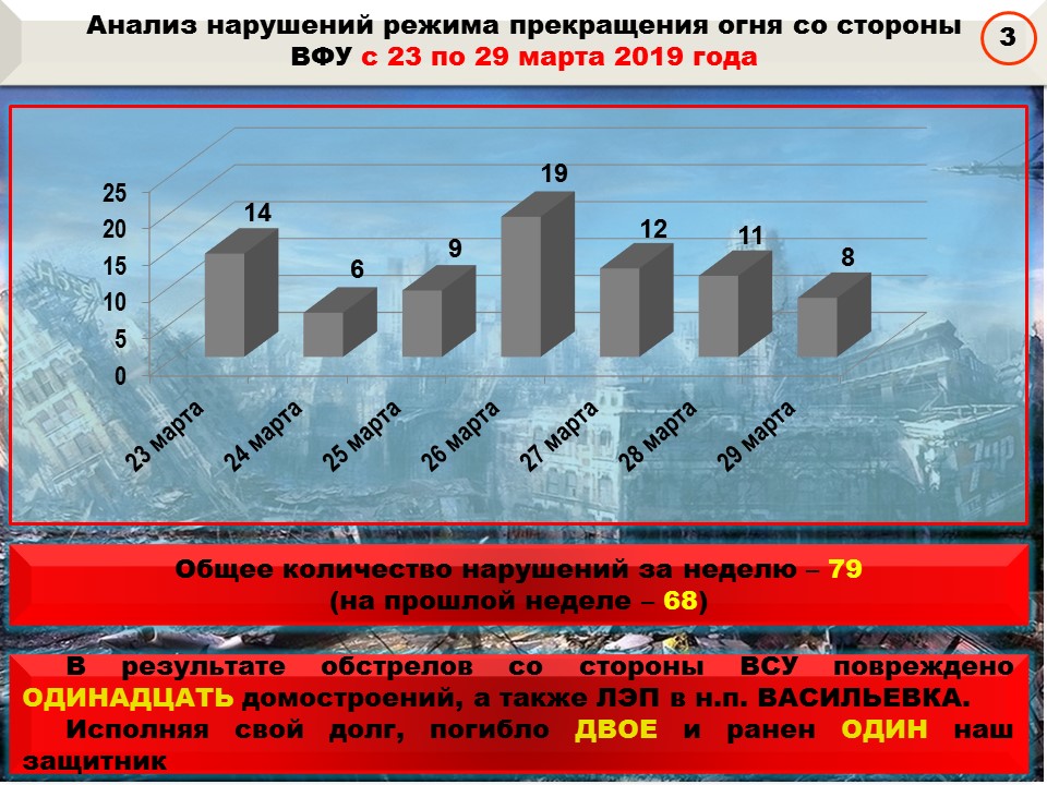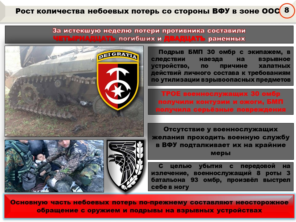 За прошедшую неделю потери противника составили 14 погибших и 20 раненых. Основную часть небоевых потерь по-прежнему составляют неосторожное обращение с оружием и подрывы на взрывных устройствах. Так, установлено, что личный состав 30 отдельной механизированной бригады халатно относится к требованиям утилизации взрывоопасных предметов и неразорвавшихся боеприпасов, что привело к санитарным потерям среди личного состава и выводу из строя одной единицы бронетехники. 25 марта, в связи с неисправностью выстрела противотанковой управляемой ракеты, украинские военнослужащие не придумали ничего лучшего, как закопать ракету на территории собственных позиций и после наезда БМП, ракета сдетонировала и произошел подрыв машины с экипажем. Как результат, трое военнослужащих получили контузии и ожоги, БМП получила серьезные повреждения.