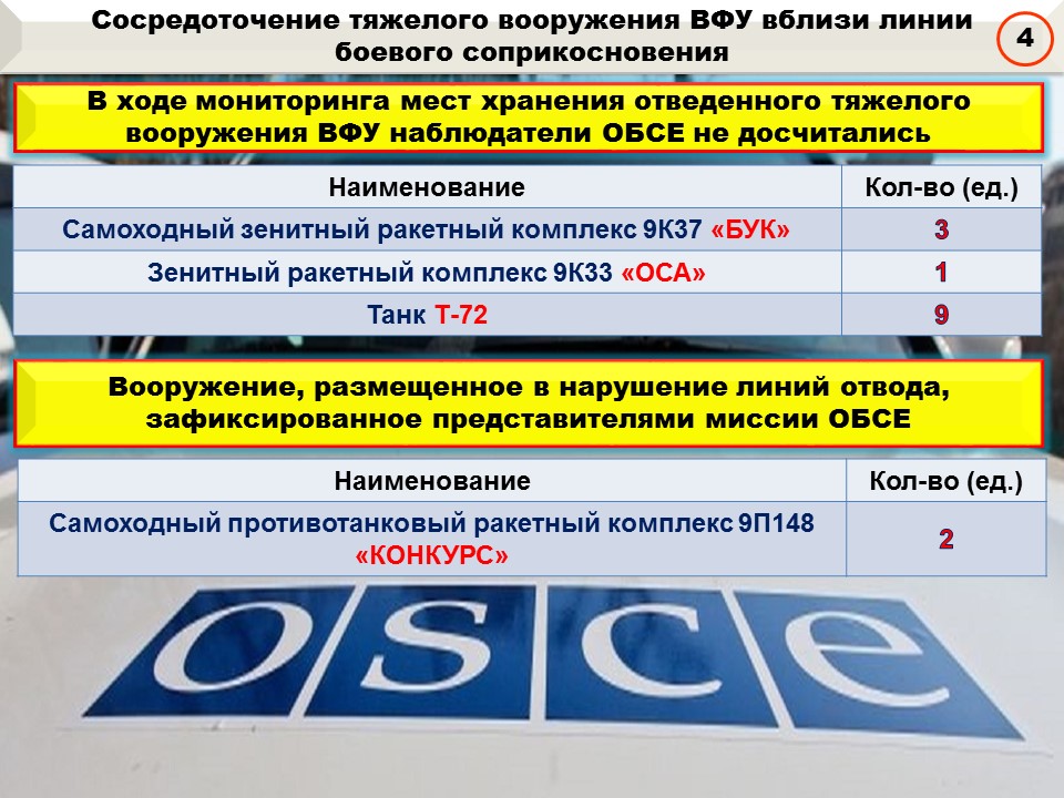 Кроме того, наблюдатели СММ ОБСЕ зафиксировали вооружение ВСУ, размещённое в нарушение линий отвода: ДВА 135 мм самоходных противотанковых ракетных комплекса 9П148 «КОНКУРС».