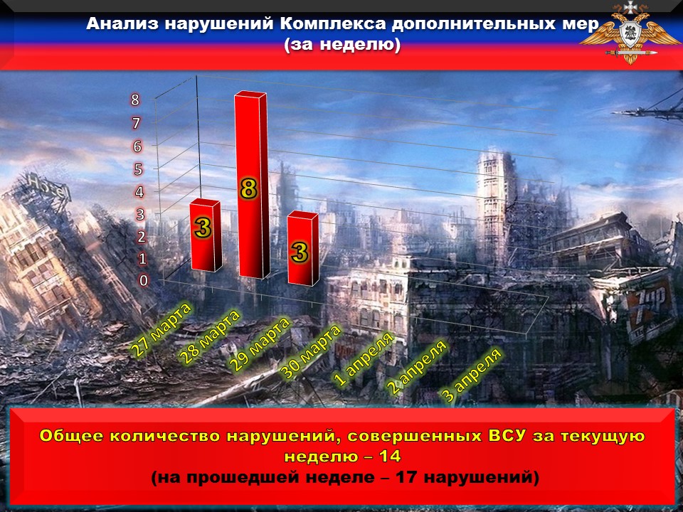 В нарушение ТРЕТЬЕГО пункта дополнительных мер, выявлено размещение ДЕСЯТИ единиц вооружения и военной техники ВФУ вблизи жилых домов и муниципальных объектов на подконтрольной Украине территории.