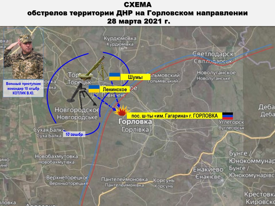 На Горловском направлении боевики 10 бригады ВФУ, по приказу военного преступника КОТЛИКА, с позиций в районах н.п. ШУМЫ и ЛЕНИНСКОЕ открыли минометный огонь по району поселка шахты «им. Гагарина» г. Горловка, выпустив 5 мин калибром 82 и 120 мм.