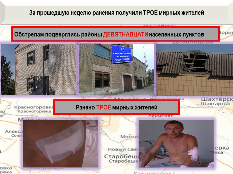 Прошедшая неделя не обошлась без жертв среди мирного населения. Украинские террористы продолжили прицельно обстреливать населенные пункты Республики, преимущественно, жилые кварталы и объекты гражданской инфраструктуры. Так, в результате целенаправленного огневого воздействия с применением запрещенных Минскими договоренностями средств со стороны пособников военного преступника Наева ранения получили ТРОЕ мирных граждан в н.п. ЗАЙЦЕВО, ГОРЛОВКА, КОМИНТЕРНОВО. Также, 20 июня обстрелу подвергся район насосной станции первого подъема Южнодонбасского водовода вблизи н.п. ВАСИЛЬЕВКА. Украинские террористы стремились сорвать ремонтные работы бригады, которая занималась восстановлением электропитания жизненно важного объекта.