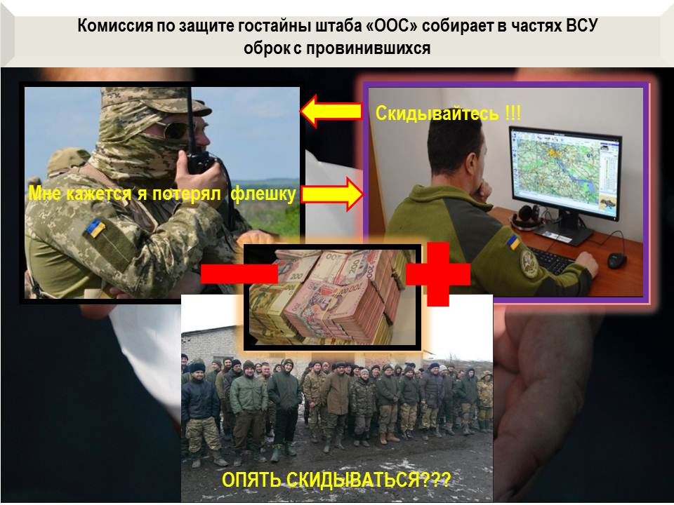 Наша разведка фиксирует работу в соединениях и частях ОТГ «Север» и «Восток» комиссии службы защиты гостайны штаба «ООС» по выявлению каналов утечки информации. Стоит отметить, что данная комиссия также как и многие из штаба оккупационных сил не против использовать выявленные недостатки для личного обогащения своих членов. В частности, услуги по закрытию дела об утрате флешностителя с военными секретами обошлись начальнику вооружения центра логистики объединенного командного пункта объединенных сил подполковнику Емельянову Я.А. в сумму 20 тысяч гривен. При этом деньги были собраны, в том числе, и с других членов инспекции полевых артиллерийских складов. Стоит отметить, что комиссия защиты гостайны после получения таких денег с легкостью закрыла глаза на то, что офицеры службы вооружения проводили фото и видео фиксацию объектов складов с привязкой к местности и геолокацией на личные телефоны. По некоторым данным, эти фотографии попали в ненужные руки.