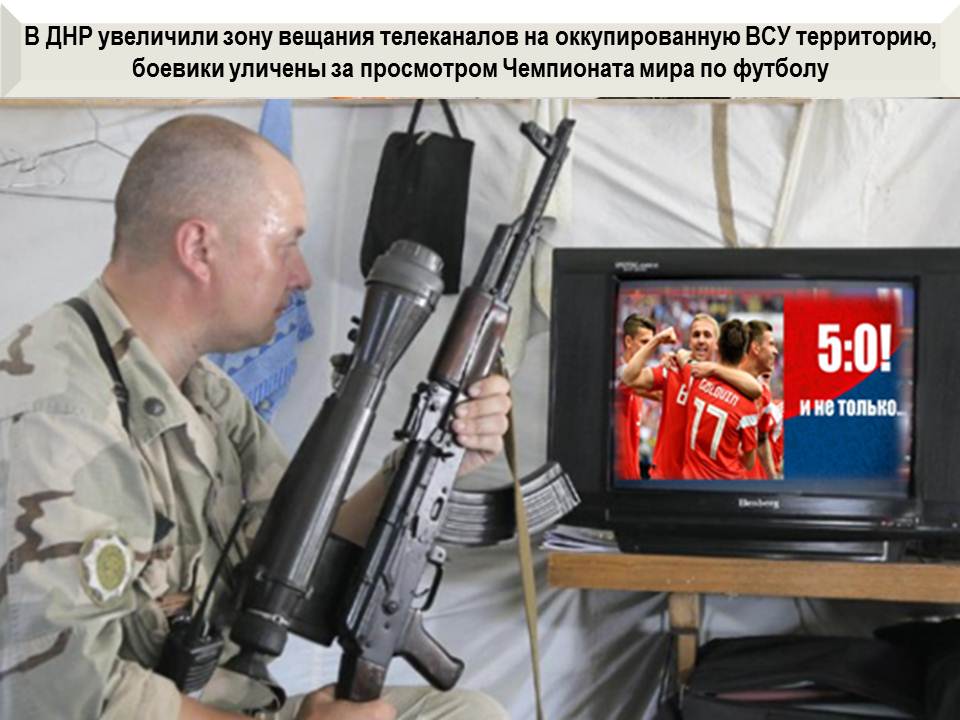 И в заключение, властями Донецкой Народной Республики на время проведения чемпионата мира по футболу увеличена зона вещания телеканалов, транслирующих футбольные состязания. В этой связи украинские военные могут отвлечься от выполнения преступных приказов своего командования и насладиться игрой любимых команд. Жители Республики уже отметили снижение количества обстрелов с началом чемпионата и во время проведения игр. При этом, на отдельных позициях наши военнослужащие подтверждают факты не только прекращение огня со стороны боевиков во время игр, но и крики радости после победы российской команды. Нам приятно, что не у всех украинских боевиков мозги промыты киевской пропагандой, а это значит, что еще есть на той стороне люди, с которыми можно договариваться о мире.