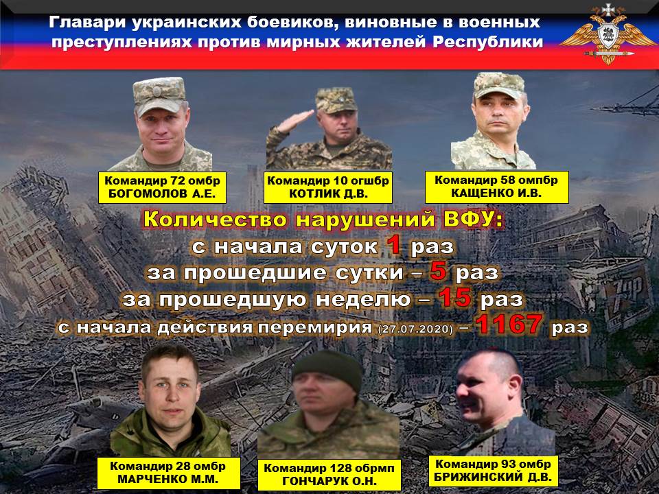 Факты нарушений в оперативном порядке доведены до представителей украинской стороны в СЦКК, с целью своевременного принятия мер к нарушителям перемирия и исключения случаев фальсификации учетных данных о нарушениях режима прекращения огня со стороны украинских боевиков.