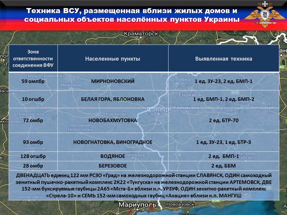 Кроме того, выявлены ДВЕНАДЦАТЬ единиц 122 мм РСЗО «Град» на железнодорожной станции СЛАВЯНСК, ОДИН самоходный зенитный пушечно-ракетный комплекс 2К22 «Тунгуска» на железнодорожной станции АРТЕМОВСК, ДВЕ 152-мм буксируемые гаубицы 2А65 «Мста-Б» вблизи н.п. УРЗУФ, ОДИН зенитно-ракетный комплекс «Стрела-10» и СЕМЬ 152-мм самоходных гаубиц «Акация» вблизи н.п. МАНГУШ.