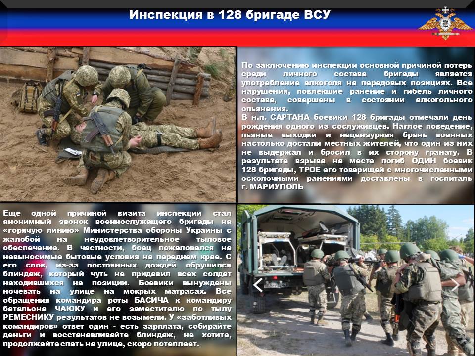 Прошедшая неделя отмечена внезапной проверкой подразделений 128 огшбр комплексной инспекцией Генерального штаба ВСУ. По имеющимся у нас данным, причинами внезапной проверки стали небоевые потери бригады, которые за прошедшие семь дней составили ТРОЕ погибших и ПЯТЕРО раненных, а также состояние тылового обеспечения, которое продолжает оставаться на крайне низком уровне.