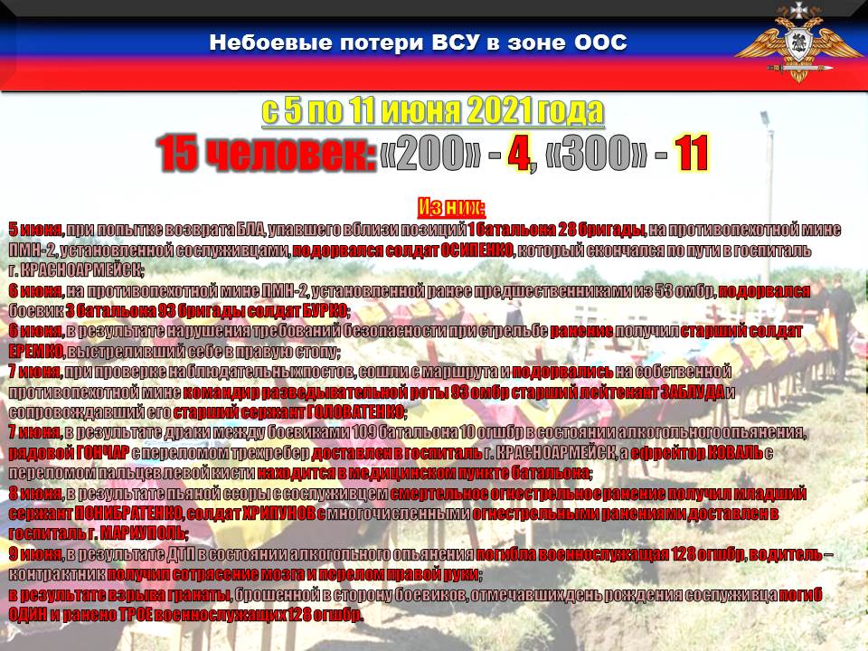 Так, по имеющимся у нас данным, в период с 5 по 11 июня в соединениях и частях ОТГ «Восток» небоевые потери составили ПЯТНАДЦАТЬ человек, из них ОДИННАДЦАТЬ получили ранения и травмы, ЧЕТВЕРО погибли: